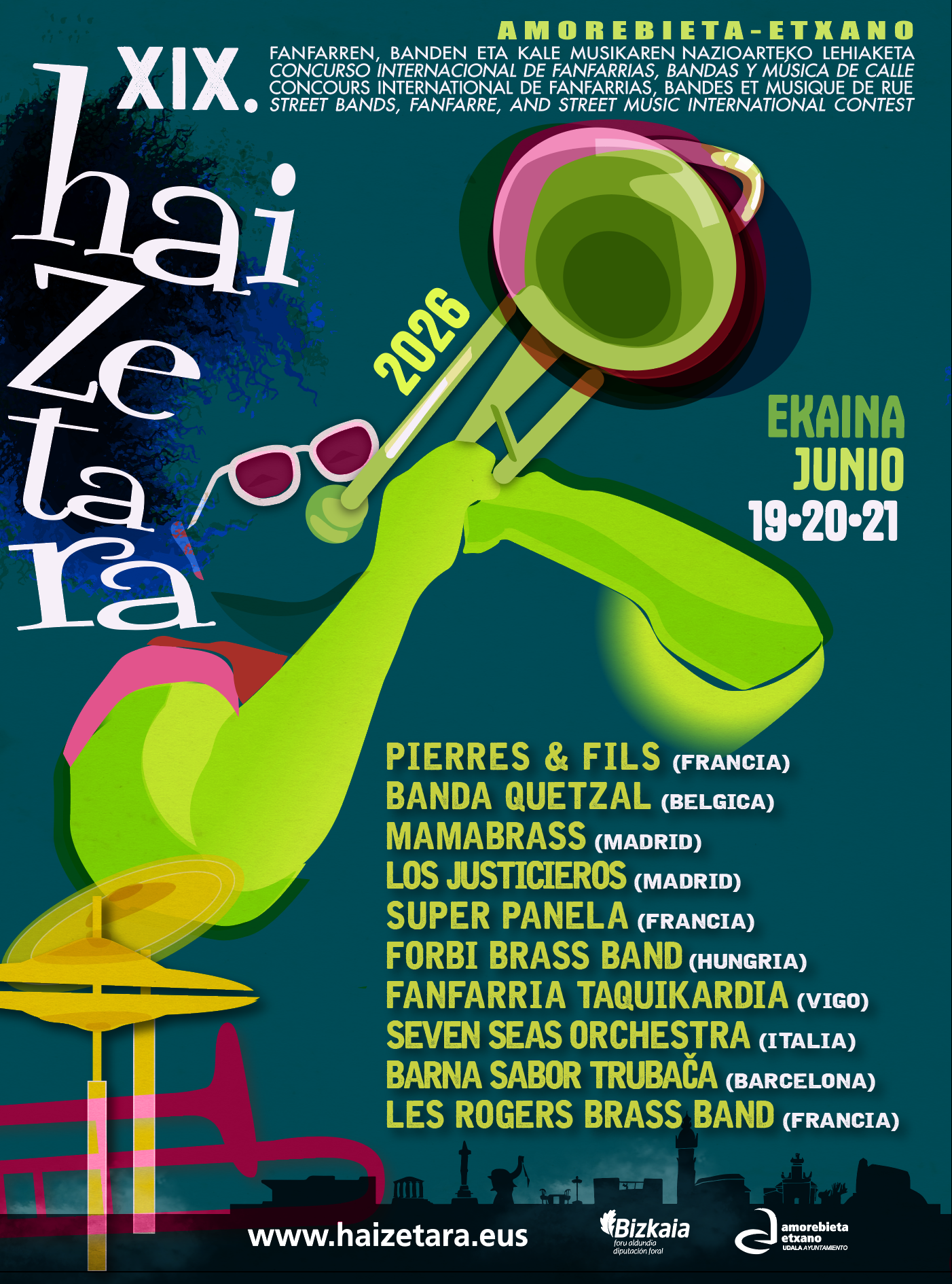 El cartel de esta edición reúne a una decena de formaciones procedentes de distintos puntos de Europa: Pierres & Fils (Francia), Banda Quetzal (Bélgica), Mamabrass (Madrid), Los Justicieros (Madrid), Super Panela (Francia), Forbi Brass Band (Hungría), Fanfarria Taquikardia (Vigo), Seven Seas Orchestra (Italia), Barna Sabor Trubacà (Barcelona) y Les Rogers Brass Band (Francia)