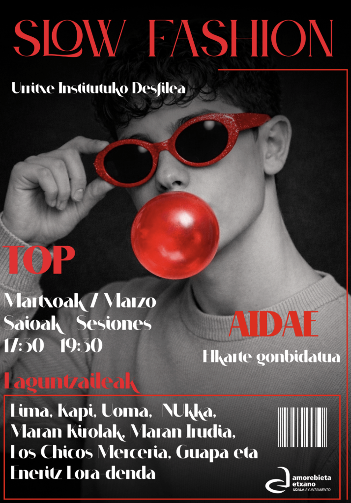 Las y los jóvenes del Instituto Urritxe dan a conocer las propuestas de moda de los comercios locales en este desfile. El tema central será la “Slow fashion” y además de desfilar, las personas que se acerquen podrán escuchar música en directo y ver las coreografías creadas por los y las jóvenes.