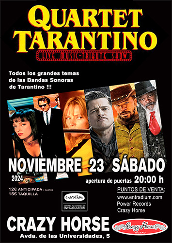 Vuelve QUARTET TARANTINO a Bilbao el próximo sábado 23 de Noviembre. Toda la energía, fuerza y descaro de las bandas sonoras de Quentin Tarantino de la mano de los mismos Reservoir Dogs dándole duro en el Crazy Horse Bilbao. Arréglate para la fiesta más loca y divertida sumergiéndote en el universo musical de las pelis de Tarantino. Ya tú sabes “Prepárate para Volar”